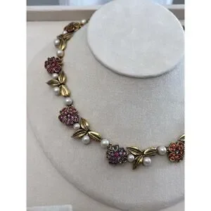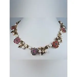 Designer Nina Ricci floral necklace in gold-tone metal. Pink and red crystal pavé flowers decorate the chain. Faux pearls sit between floral motifs. Classic, feminine accent for dressy looks.