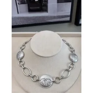 Nina Ricci branded necklace with textured round medallions. Silver-tone oval links connect the embossed charms. Subtle shine for refined styling. Easy to pair with day or evening looks.