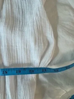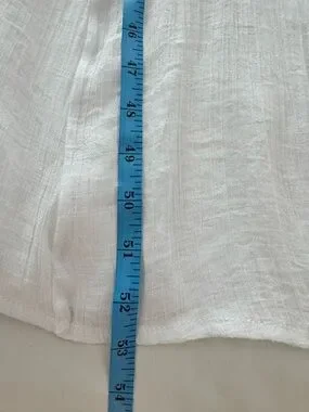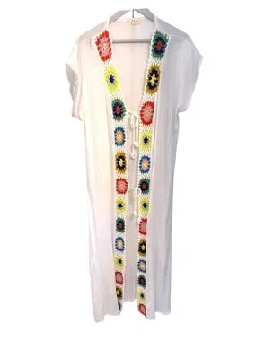 Boho white gauze cover up with colorful crochet trim. Lightweight, sheer, and flowy—perfect for beach, resort, or festival styling.