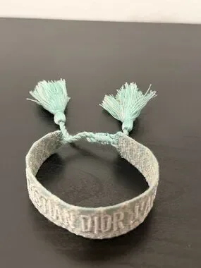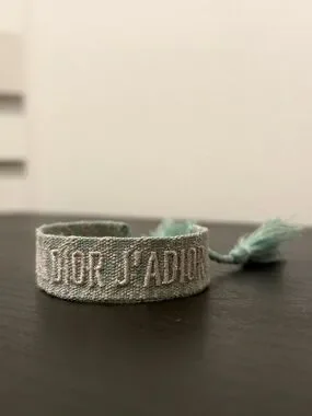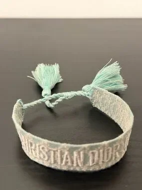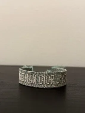 Woven cuff bracelet featuring embroidered Christian Dior logo. Light green and white threads create a subtle pattern. Open cuff silhouette for easy wear. Sleek designer accessory for everyday styling.