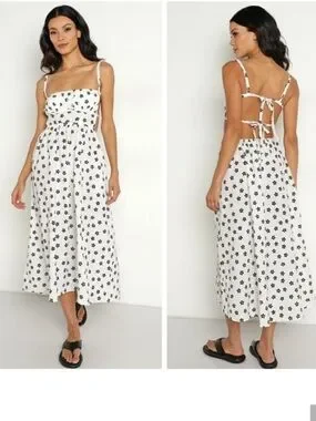 This dress has a fitted bodice with delicate adjustable straps and a flowy midi skirt that moves beautifully with every step.
