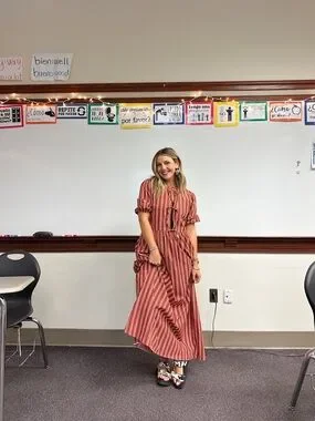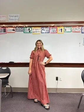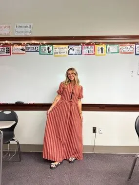 So cute and wore it a couple of times just a tad long for me and ready to move on. In perfect condition and fits true to size. Color is labeled “brown stripe” but it’s more of a maroon/red.
