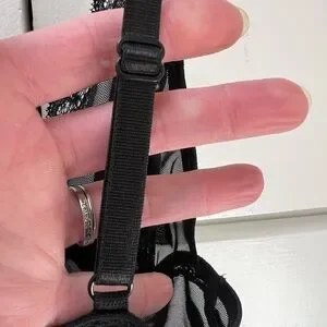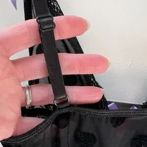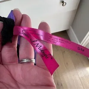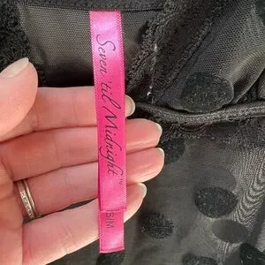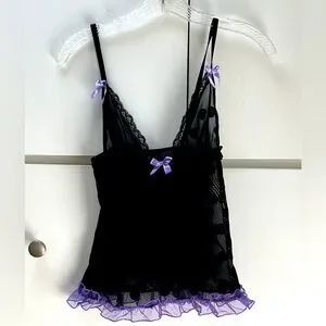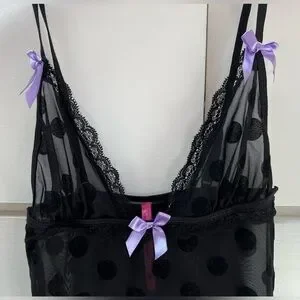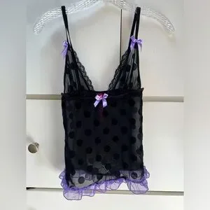 Seven til Midnight adorable black on black polka dot and purple cami and panty set in size S/M. So cute with purple bows and purple ruffles on the bottom of the cami. Panties have black on black polka dot with a purple bow on the front and a purple ruched back. Straps are adjustable. This set is so cute!!! In excellent condition.