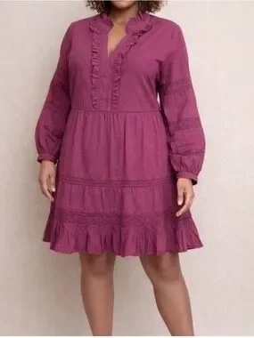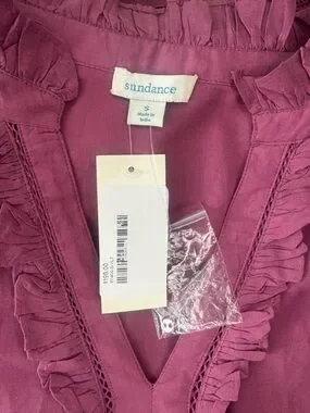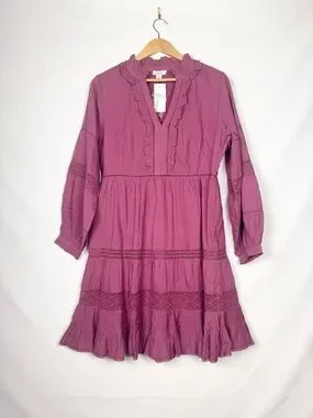 Sundance Ruffled Boho Cottage Style V-Neck Long-Sleeve Dress in Plum Mauve Sz S
