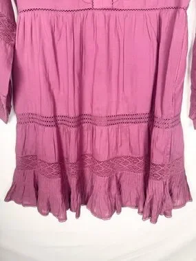 Sundance New With Tags gorgeous boho peasant dress in a stunning dusty rose / mauve shade. This romantic long sleeve dress features beautiful lace inset details, ruffle trim neckline, and a flattering tiered silhouette with a feminine ruffle hem.
