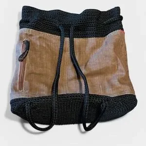 The Sak Vintage Crochet Sayulita Drawstring Backpack Bohemian Black Brown