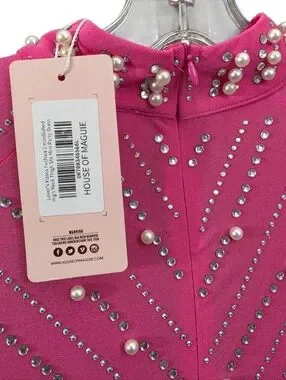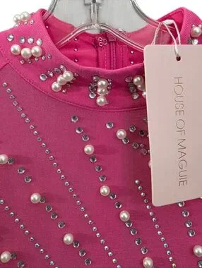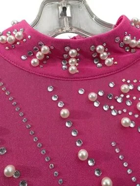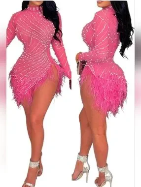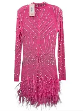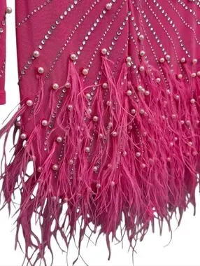 Nwt House Of Maguie Hot Pink Longsleeve Rhinestone,feathers & pearls Party Dress