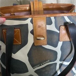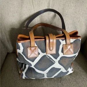 Dooney & Bourke shoulder bag with giraffe-inspired print. Cream background with black/charcoal patches. Tan leather trim, handles, and strap detail. Signature logo on front and a charm accent. Classic structured silhouette for everyday use.