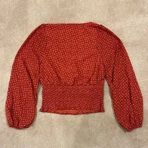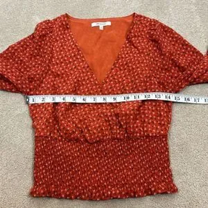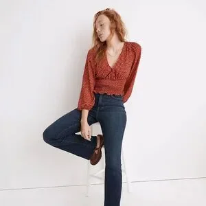 Sweet and smocked in airy (Re)sourced recycled crinkle georgette, this cropped faux-wrap top is fitted through the waist. Cute bubble sleeves and a ruffled hem make it a romantic dream.