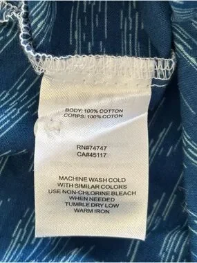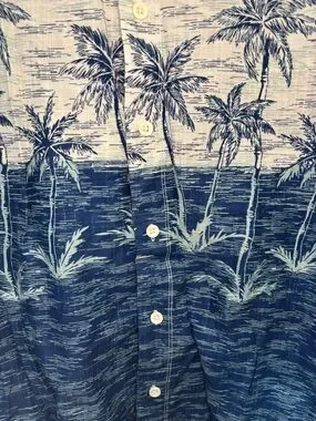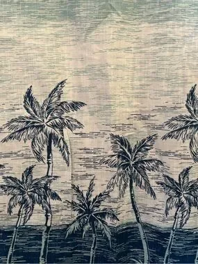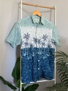 Casual short-sleeve button-down with tropical palm motif. Gradient teal to blue colorway for a relaxed look. Lightweight, breathable fabric ideal for warm days. Classic collared silhouette for easy styling. Excellent condition!