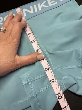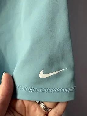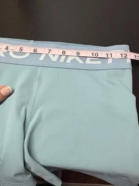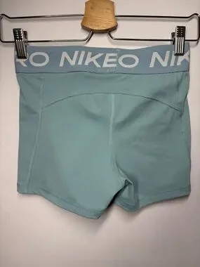 Light blue Nike Pro training shorts. White Swoosh logo on hem. Stretchy fabric suitable for workouts. Great used condition. See photos for measurements.