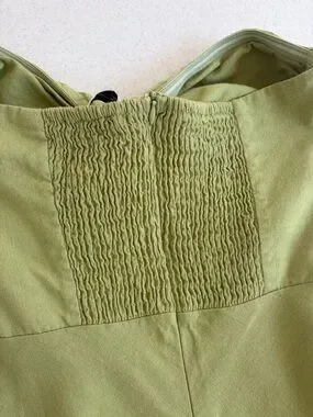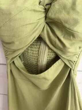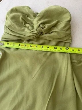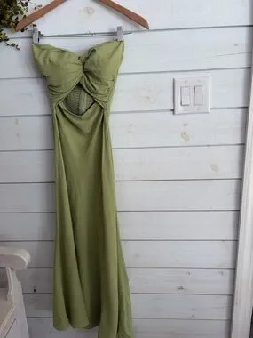 Beautiful lightweight green strapless dress with cut out in the front. Dress would be ideal for a party or summer wedding. Back has a bit of stretch to it.