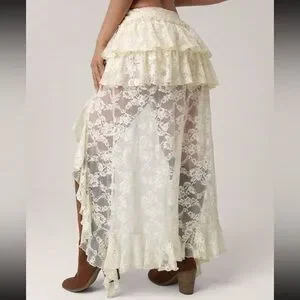 Boutique new unworn just didn’t fit. Bohemian cream lace maxi skirt with layered tiers and a hi-low silhouette. Delicate ruffle trim and sheer lace panels. Styled in photo with a western-inspired brown belt not included. Flowy, romantic look for festival or casual wear.
