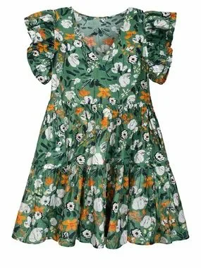 Green Floral Ruffle Sleeve Tiered Dress Size M Cotton Lined Boutique