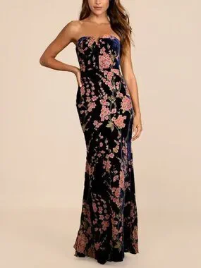 The Lulus Bloom In Mind Navy Blue Floral Print Velvet Strapless Maxi Dress is always in our thoughts! Smooth velvet, with a pink and green burnout floral print, creates a notched sweetheart neckline (with a hidden V-bar and no-slip strips) and a strapless. Original listing: https://www.lulus.com/products/bloom-in-mind-navy-blue-floral-print-velvet-strapless-maxi-dress/1566796.html