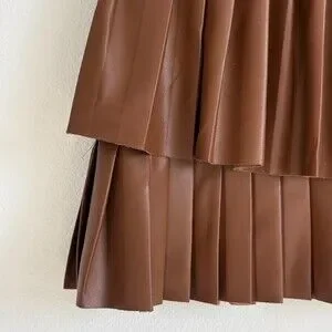 Zara pleated mini skirt in brown faux leather. Features a wide belted waist with round buckle. Structured pleats create a flared silhouette. Stylish and versatile for day or night.