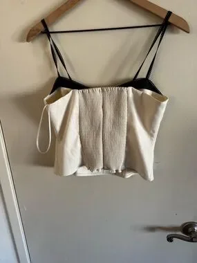 Elegant cream bustier camisole by Reformation. Soft satin-like fabric with structured seams. Thin black trim and delicate spaghetti straps. Feminine and versatile for day or night.