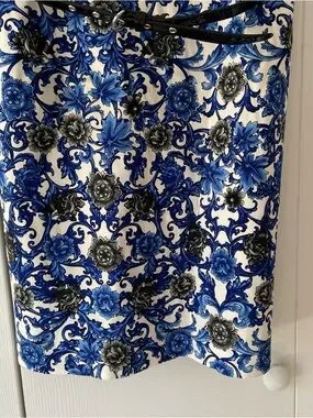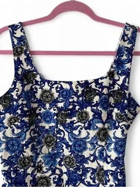 Make a statement with this stunning Premise Dresses sheath dress. Featuring a bold, intricate floral damask/baroque print in vibrant royal blue, white, and black, this dress offers a sophisticated silhouette that transitions perfectly from a day at the office to an evening event.