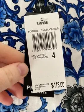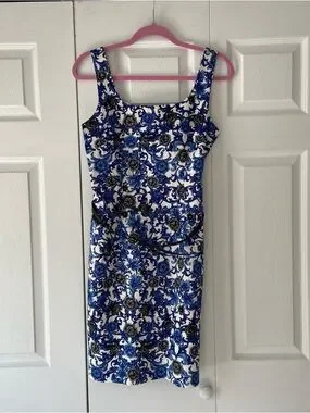 Premise Blue White Floral Damask Sheath Dress Size 4 NWT Belted Boho Career