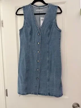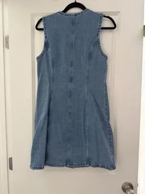 Sleeveless denim mini with a V-neckline. Front button closure and seam detailing for a streamlined fit. Casual, easy-to-style piece for everyday wear.
