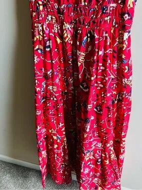 A lightweight red floral maxi dress with a fitted smocked waist and short sleeves. Flattering tiered skirt for easy movement. Vibrant red print adds a fresh, feminine touch. Perfect for daytime events or weekend outings.