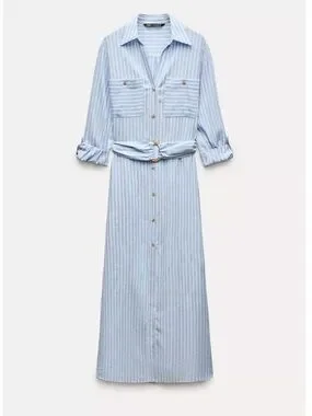Lightweight Zara midi shirt dress. Vertical light blue and white stripes. Button-front with chest pockets. Self-tie belt with loop detail. Long sleeves with roll-tab style. Casual and polished look.
