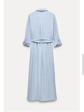 Zara Light Blue and White Striped Linen Blend Midi Shirt Dress