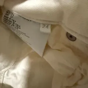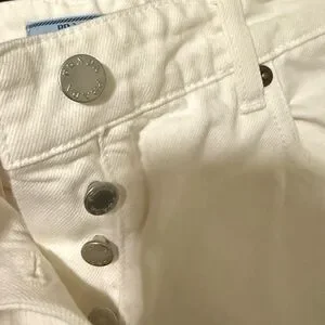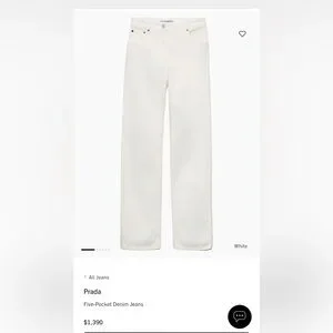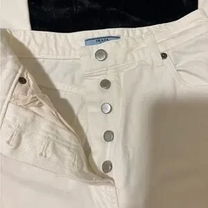 White denim jeans featuring a gold Prada triangle logo plaque. Clean design with visible branded detailing. Simple and elegant style.