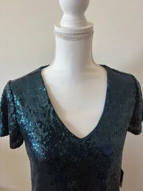 Black sequin midi dress with a V-neck. Short sleeves and relaxed A-line silhouette. Shimmering finish for evening wear.