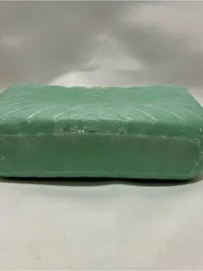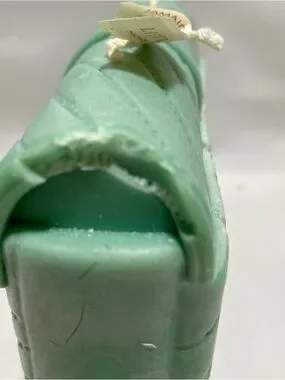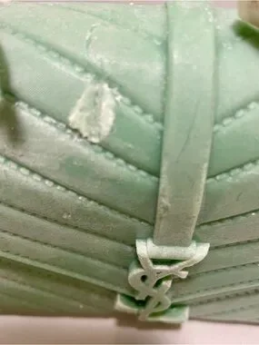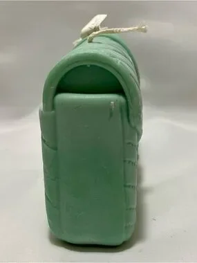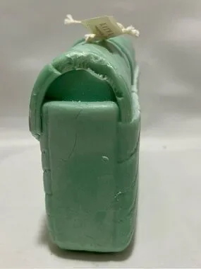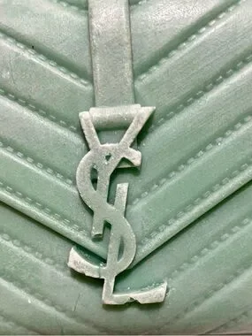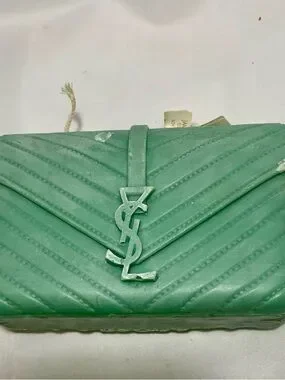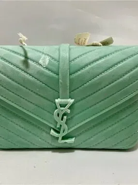 The candle shown in the image is a sculptural piece designed to resemble a Saint Laurent College Bag. It is a mint green, hand-poured decorative candle that features intricate details