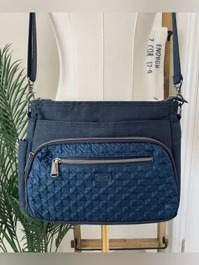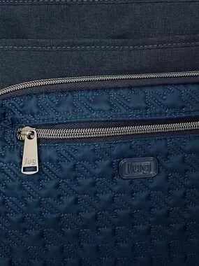 Lug Shimmy - perfectly designed navy crossbody bag with quilted front pocket. Adjustable strap for hands-free wear. Multiple zip pockets for organized storage. Durable easy to care for fabric and gun metal toned hardware.