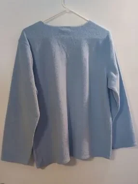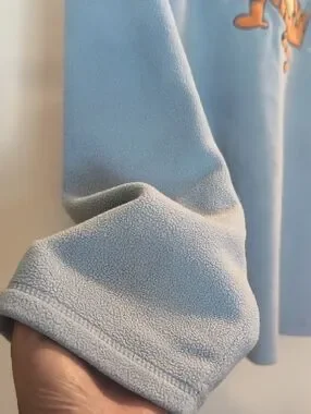 Light blue fleece long-sleeve top with embroidered Tigger at center. Crewneck design with subtle snow accents. Soft, cozy fabric for everyday wear.