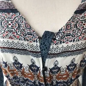 Has a front button style with tie. Size xsmall. One flaw is the first button is missing.