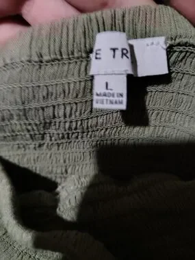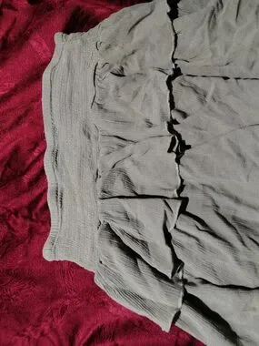 Lightweight tiered skirt with ruffle details. Elastic waistband for comfort. Soft, textured fabric. Subtle sage green color.