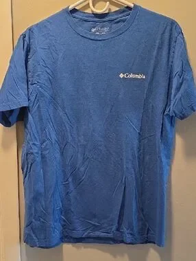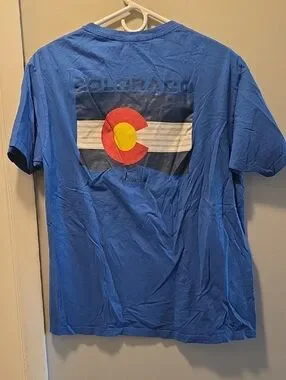 Short sleeve Columbia t-shirt. Features a bold Colorado flag graphic on the back. Bright red "C" with a yellow center. Soft cotton casual style. Easy to pair with jeans or shorts.