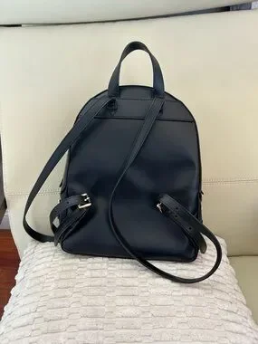 Compact pebbled leather backpack by Michael Kors. Front zip pocket and branded gold logo. Adjustable straps and top handle. Smooth gold-tone zipper details. Classic versatile silhouette.