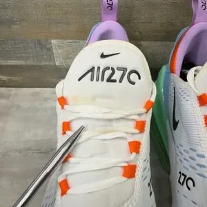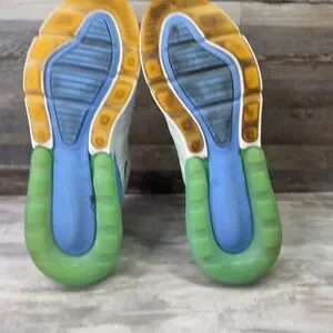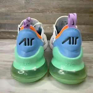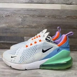 These Nike Air Max 270 sneakers deliver iconic style and responsive cushioning with a large Max Air unit in the heel. The breathable mesh upper features a vibrant multi-color design with white, light blue, mint green, and orange accents for a bold look. Perfect for athletic performance, casual streetwear, or everyday comfort.