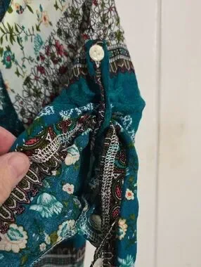 R. Vivimos Womens Dress Buttons Front Slit Teal Floral Tab Sleeves Sz M 8/10 EUC