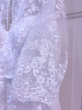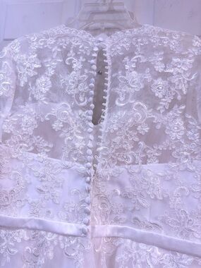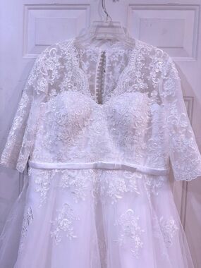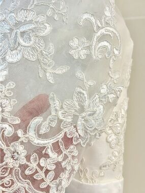 Romantic A-line silhouette with delicate lace overlay. Illusion lace sleeves and sweetheart bodice. Soft tulle skirt with embroidered appliqués. Slim satin belt accentuates the waist. Elegant button-back detail for a polished finish.