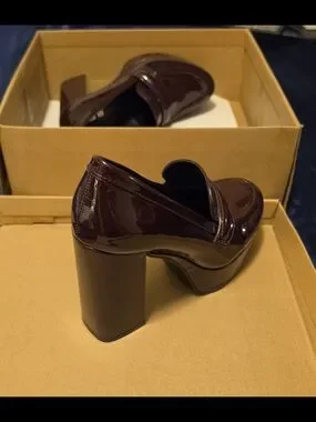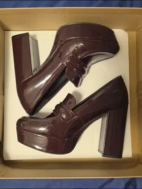 Patent loafer with a chunky platform and block heel. Slip-on style with glossy finish.