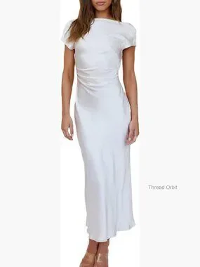 Satin Midi Dress with Cap Sleeves Ruched Waist Cowl Back Formal