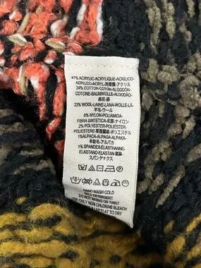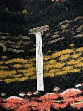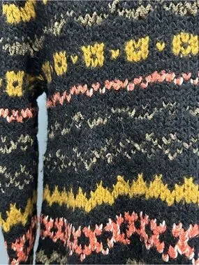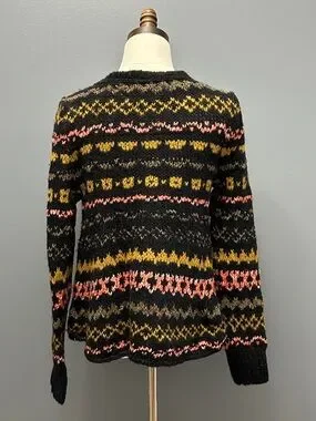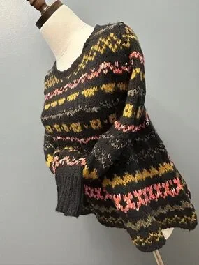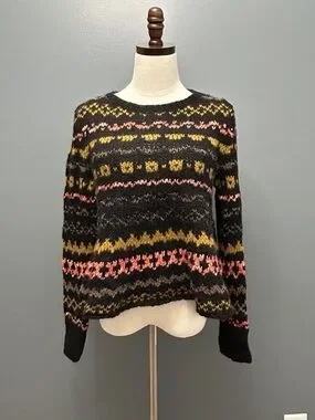 Gently preowned sweater. Black fairisle sweater with touches of green, pink and yellow. Fuzzy mixed yarns. Flared style. Size XS
