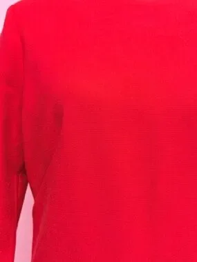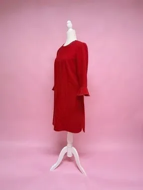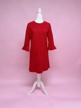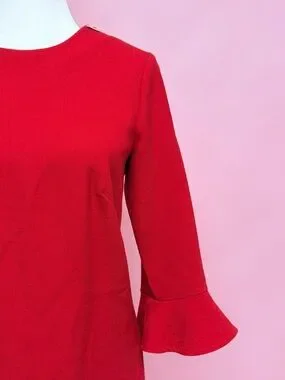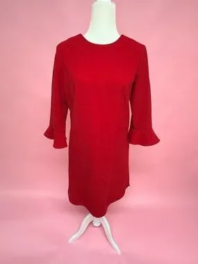 Listed is a chic red shift dress with subtle flare 3/4 sleeves for a feminine touch. The soft, smooth fabric offers comfortable all-day wear. The clean crew neckline and A-line silhouette create an effortless look. This previously loved dress is a size 8. It is considered used and may show signs of wear that include loose threads, marks, pilling, or other small imperfections. There is minor pilling under the arms and a very tiny spot near the bust as shown in the provided photos. Please review all photos and ask questions before purchasing. All items I sell are “as is”. This dress is perfect for cocktails or a night out! Approximate measurements are as follows: