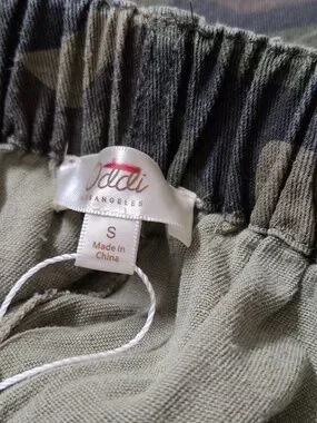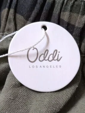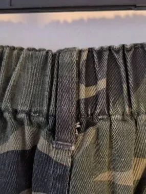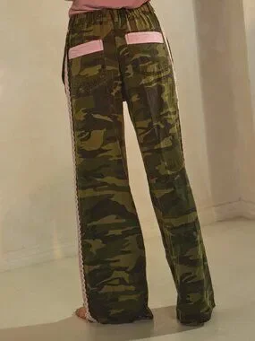 Introducing the Camo Print Pants With Lace Trim by Oddi, a playful twist on the classic camouflage design. These wide-leg, high-rise pants feature a green camo pattern with delicate pink lace trim and matching pocket accents for an edgy yet feminine touch.