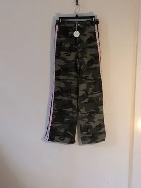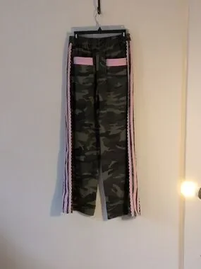 Oddi Los Angeles Washer Camo Wide Leg Pants with Pink Lace Trim S
