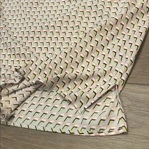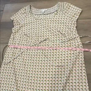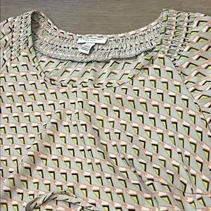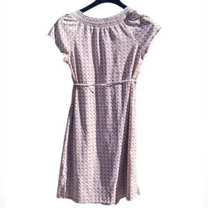 Cute maternity dress by Liz Lange for Target in EUC (no visible flaws, no visible signs of wear). Features a gray base with pink, white, and yellow geometric pattern. Approximate measurements: length 36”, 18” pit to pit laying flat, waistline 20.5” laying flat (relaxed to allow room for baby), hips 23” laying flat. Pullover, smocking around neckline, cap sleeves, removable belt with cloth belt loops, 100% polyester, very lightweight and perfect for spring/summer. First three photos taken outdoors and best reflect pink color seen in person. Model photo is AI generated for display purposes.