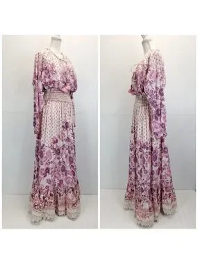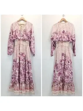 HEMANT & NANDITA Suki Maxi Dress Pink Floral Lace Boho Romantic Cottagecore S