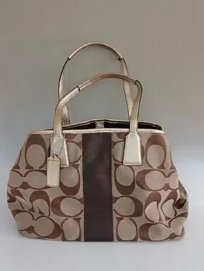 Coach signature canvas tote in brown with a central dark brown stripe and metallic gold trim. Spacious interior ideal for daily essentials. Dual top handles for comfortable carry. Stylish, versatile design that complements casual and polished looks.