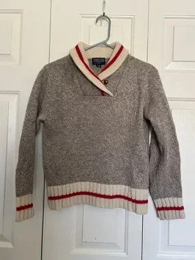 671- Cozy wool-blend shawl collar sweater. Cream collar and hem with red stripe accents. Button detail at the neckline. Ribbed cuffs and hem for a snug fit. Neutral taupe body pairs easily with many outfits.