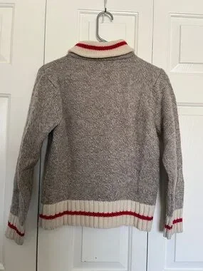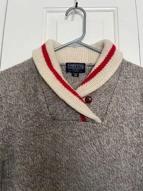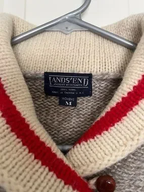 Lands' End Women’s Taupe Shawl Collar Sweater with Cream and Red Trim Size M